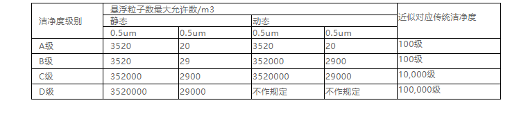 中國GMP(2010年修訂)新版GMP附錄1 無菌藥品.第三章.第九條……潔凈區各級別空氣懸浮粒子的標準規定如下